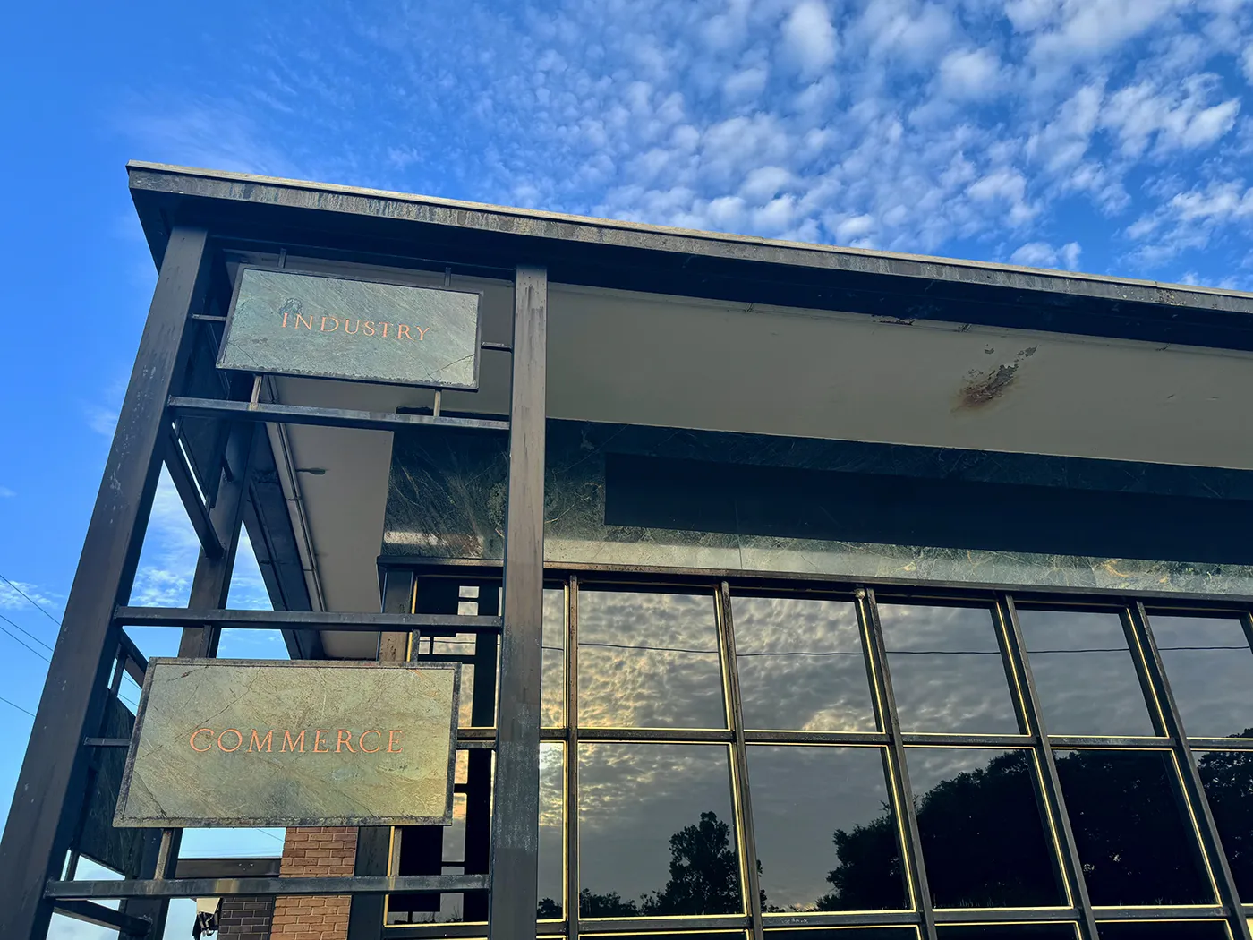 Outside my loft stood a bank building that once was a beautiful example of modernism-meets-Mobile — a flat roof and front facade of towering glass and breeze block welcomed the town’s merchants into a brick lobby tastefully if incongruously peppered with lacy wrought iron. The upper walls of the lobby bore photographic murals of the town’s dependence on timber, toned in the shade of pine needles and money. On my visit, that empty building was up for auction, its breeze blocks decades removed while its marble cornerstones exalt an ironic hope for development, progress and expansion.